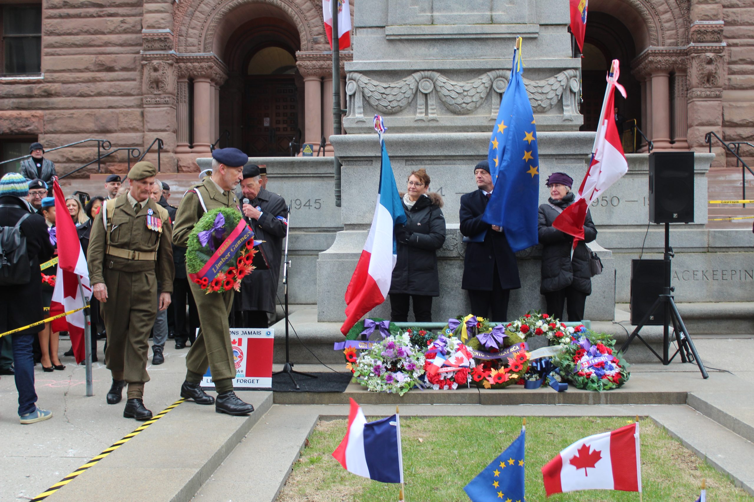 Ce discours a été suivi de celui de la mairesse de Toronto, Olivia Chow, qui a réitéré son appui à cette commémoration et souligné le courage de ces héros canadiens. Les participants ont ensuite procédé au lever des drapeaux canadien, européen et français, ainsi que l’interprétation des hymnes canadien, britannique et français.